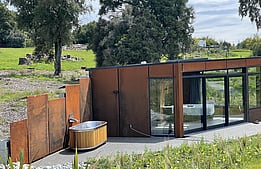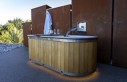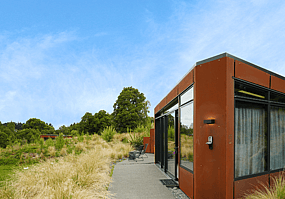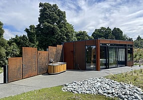Our whares are designed to reflect our natural environment and have been built with a mix of natural and raw materials, such as exposed steel beams, architectural timber walls and ceilings, natural tile floors on the inside and are clad in corten steel with exposed aggregate concrete decks outside, which house the stainless steel cedar hot tubs.
